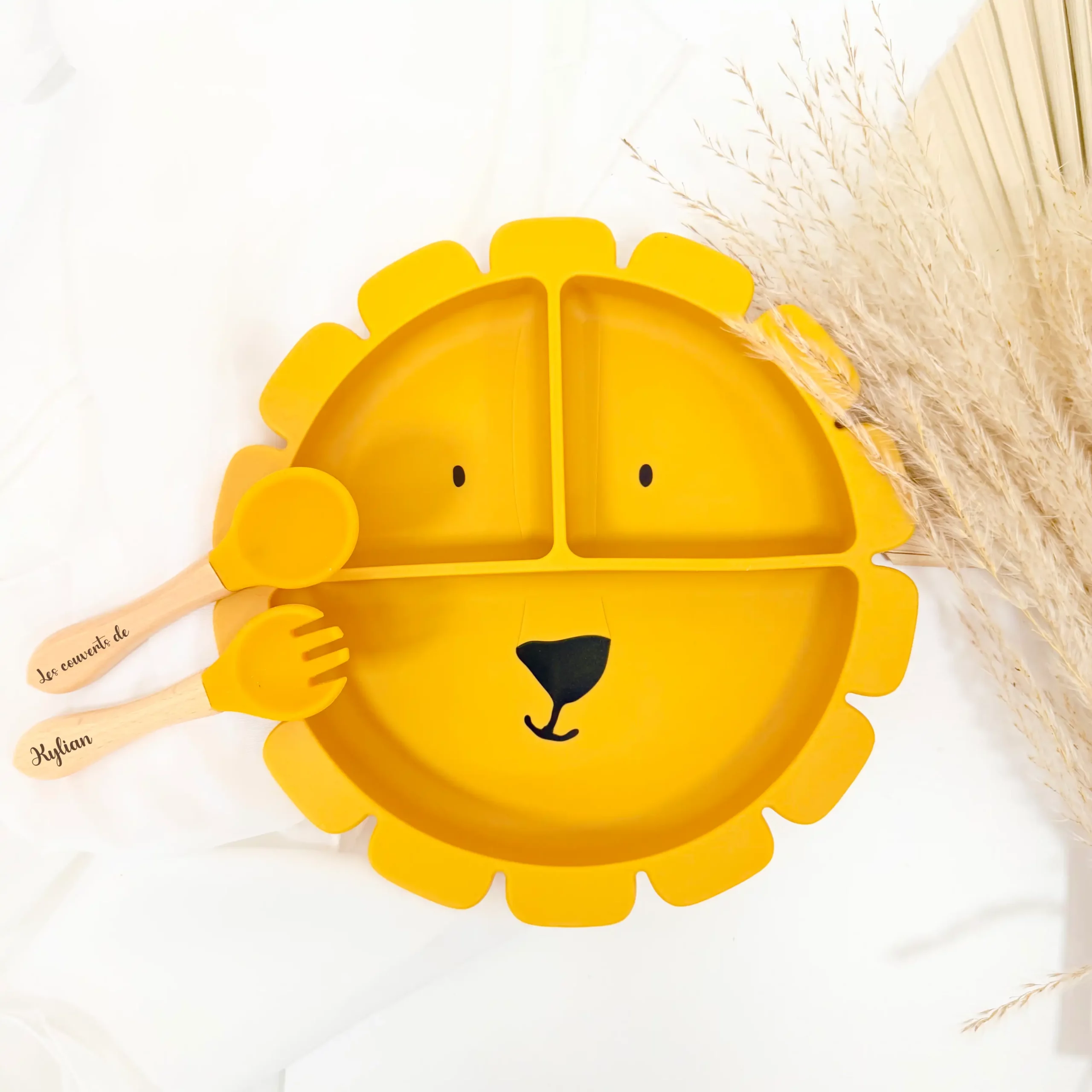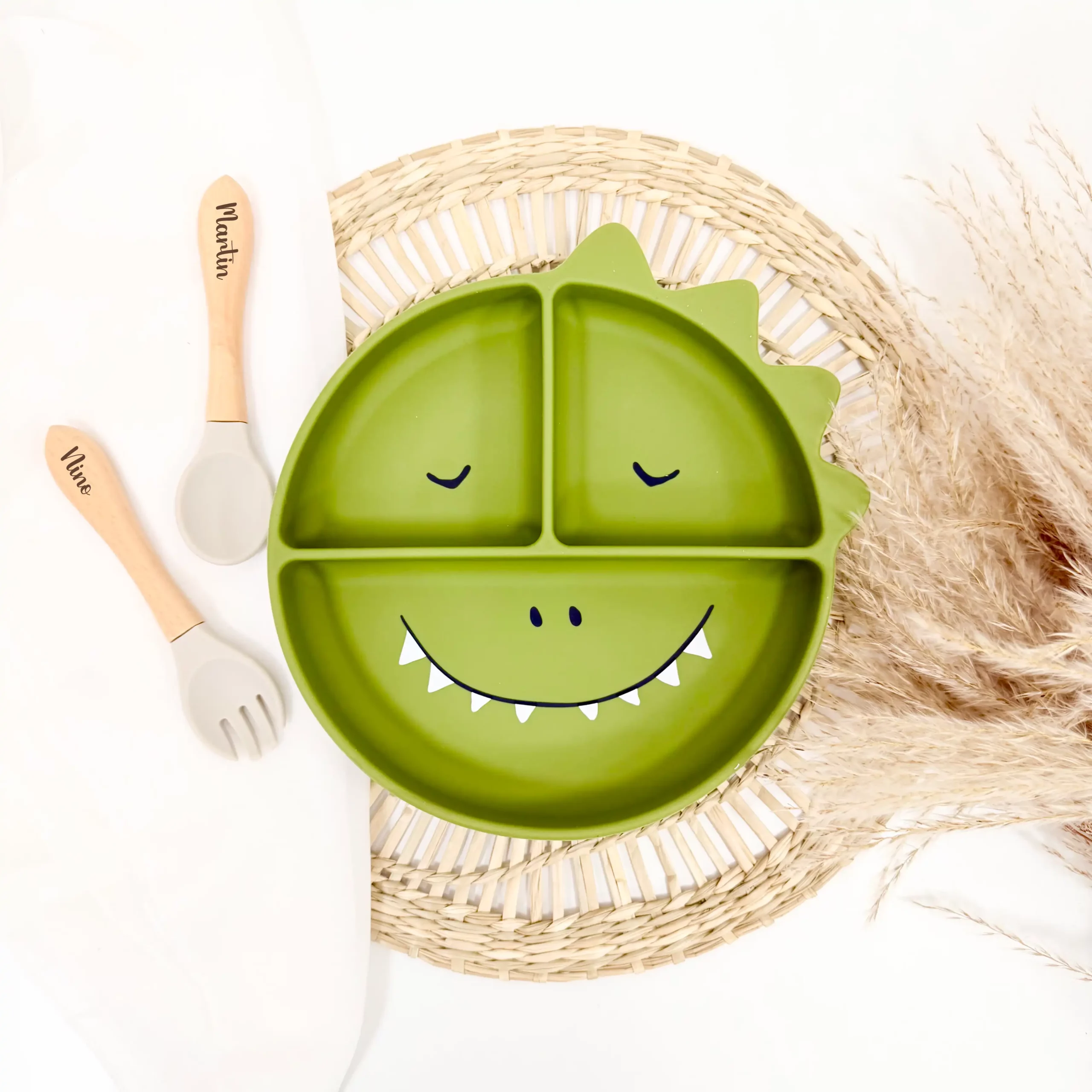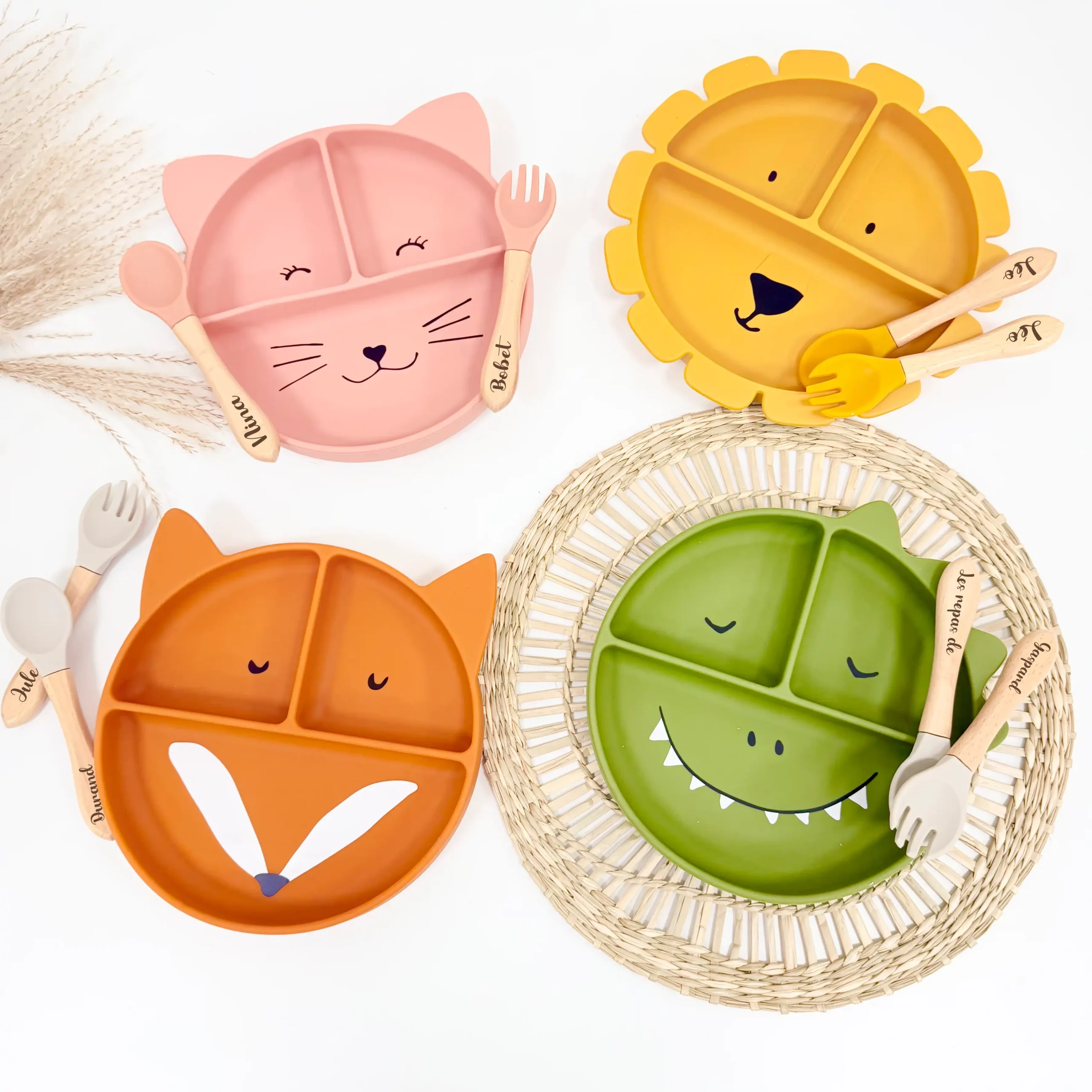 Notre Ensemble assiette en silicone avec ventouse + couverts – Animaux personnalisables, transforme chaque repas en un moment amusant et autonome. Conçue pour encourager l’autonomie alimentaire, cette assiette compartimentée permet de séparer les aliments et d’éveiller la curiosité gustative de votre enfant.