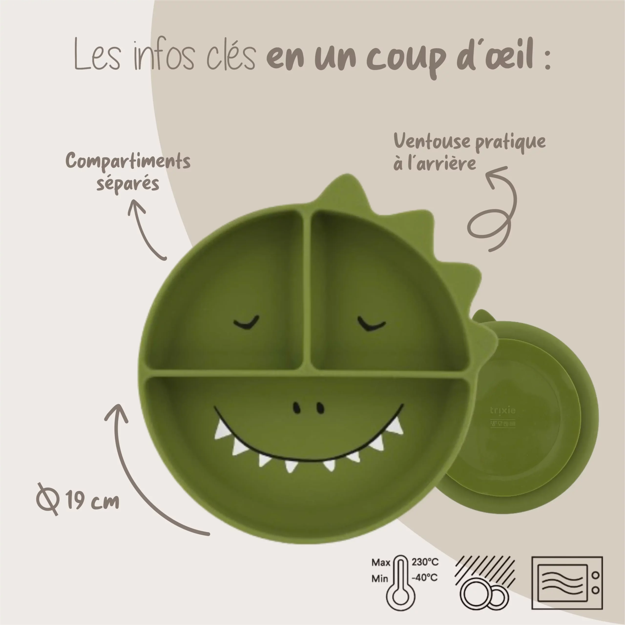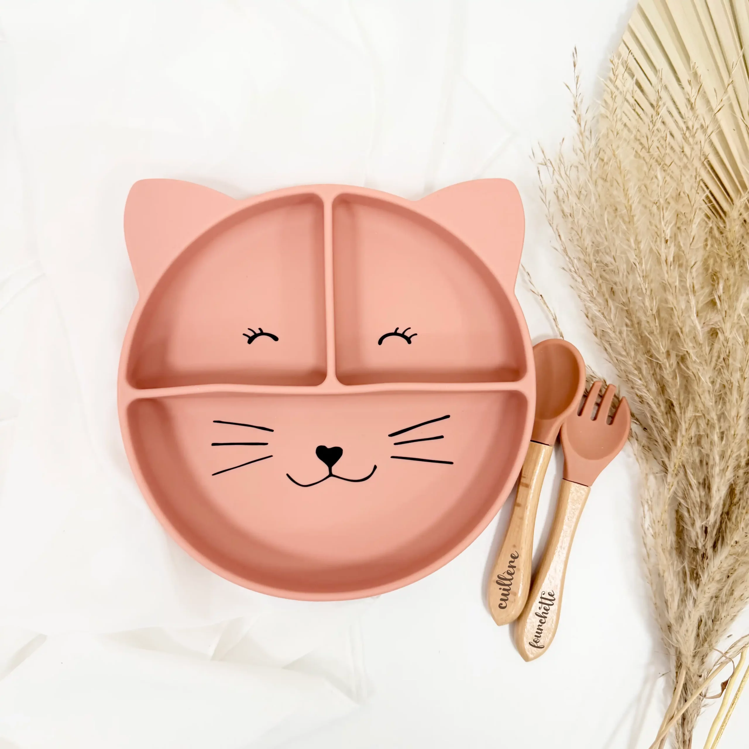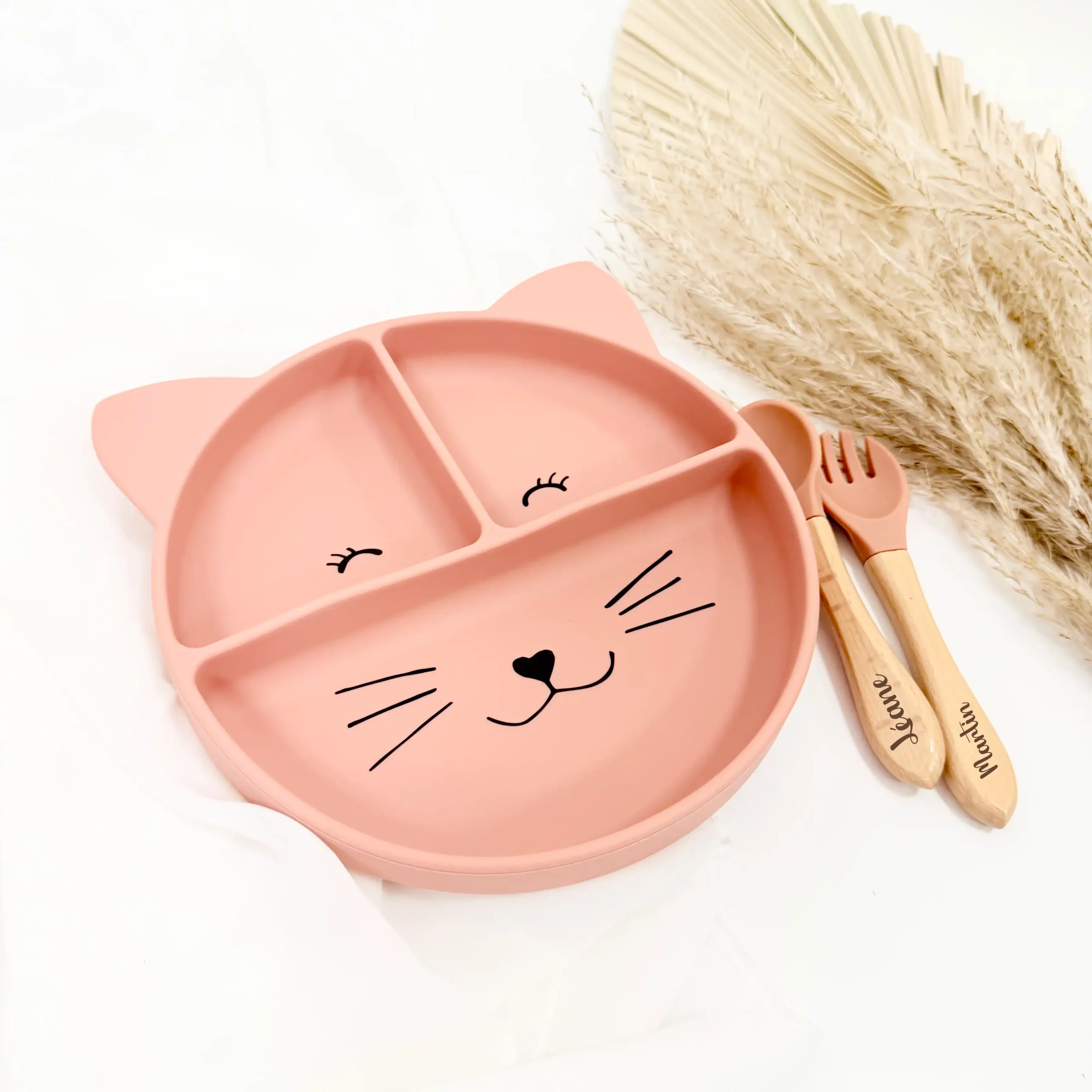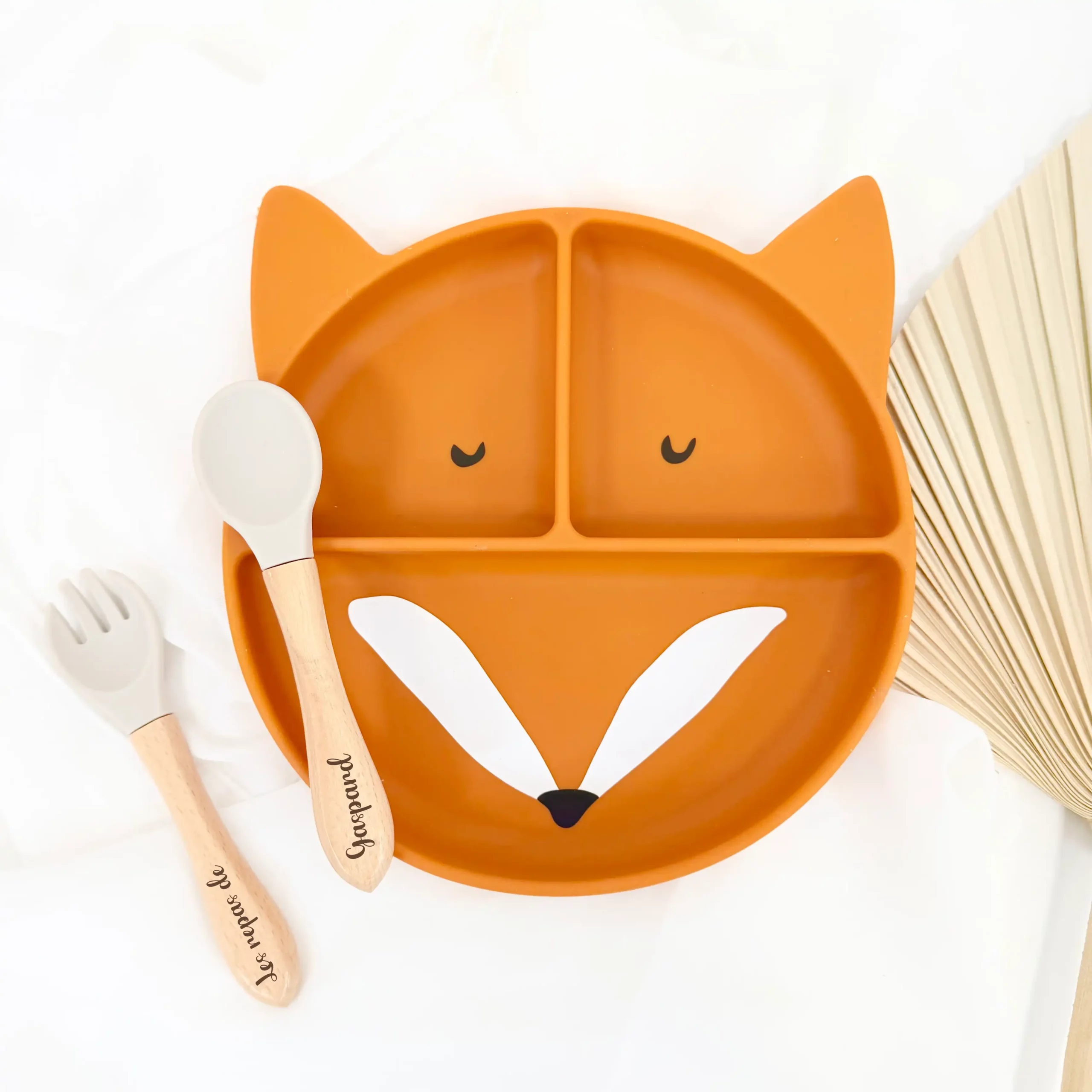 Notre Ensemble assiette en silicone avec ventouse + couverts – Animaux personnalisables, transforme chaque repas en un moment amusant et autonome. Conçue pour encourager l’autonomie alimentaire, cette assiette compartimentée permet de séparer les aliments et d’éveiller la curiosité gustative de votre enfant.